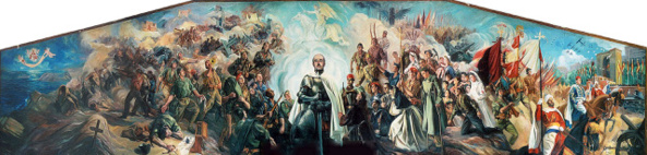 En el centro del cuadro, en una composición ilegible a primera vista, destaca una gigantesca representación de Franco con la armadura de un caballero medieval, el miles Christi encargado de defender la cristiandad contra los infieles. Pero también está vestido con la capa blanca del Gran Maestre de la Orden de Santiago, que sostiene con mano firme la espada de capitán del Ejército, la Iglesia, la Falange y los carlistas.