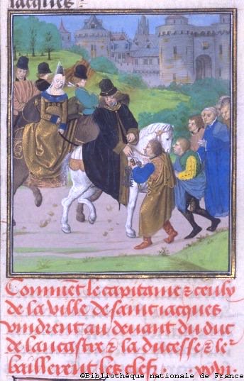 Le texte sous l’image se lit ainsi : « Comment le capitaine et ceux de la ville de Saint-Jacques vinrent au-devant du duc de Lancastre et la duchesse et leur baillèrent les clefs ».