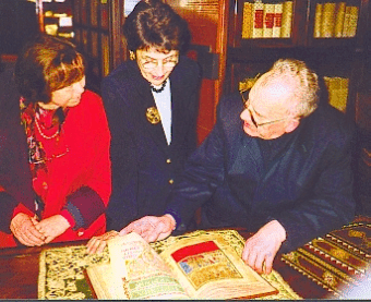 Visite de membres du Bureau de l'Union à Compostelle en 2001. Don Jaime présente le Codex Calixtinus à Denise Péricard Méa et Marie-Françoise Migeot.