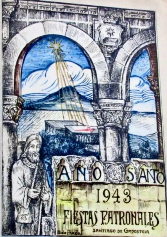 Conservée au musée du peuple galicien, cette affiche est la couverture du « Programme commercial et artistique des fêtes traditionnelles de l’apôtre saint Jacques qui seront célébrées durant le mois de juillet 1943 ».