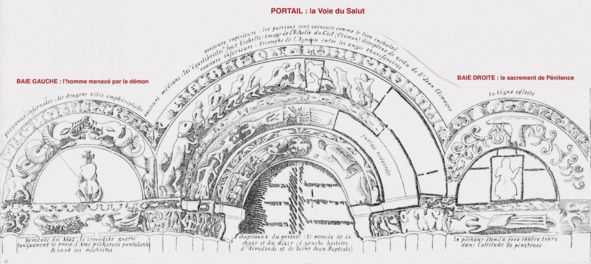En 1992, un pasteur de l'Eglise Réformée, Jean-Claude Ribagnac†, tentait une approche globale de lecture des sculptures de ce portail et proposait une interprétation théologique neuve :